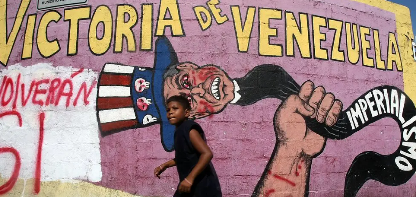 A boy walks past a mural in Caracas, Venezuela, condemning US imperialism. (Photo by Mario Tama/Getty Images)
